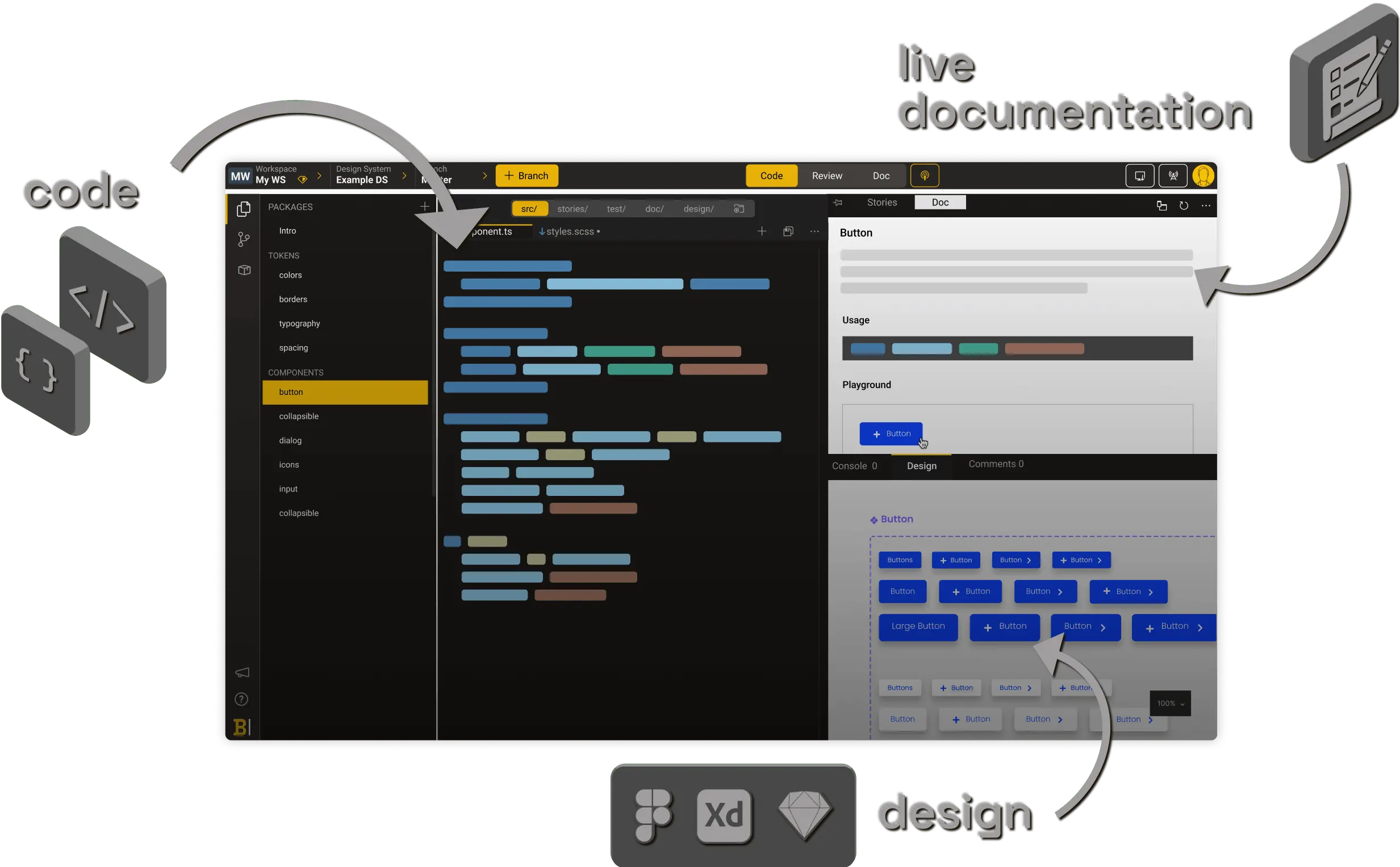 Backlight comes with an online editor that allows anyone (even non-tech disciplines) to contribute to your design system, making it simple to create branches and push to GitHub and GitLab.